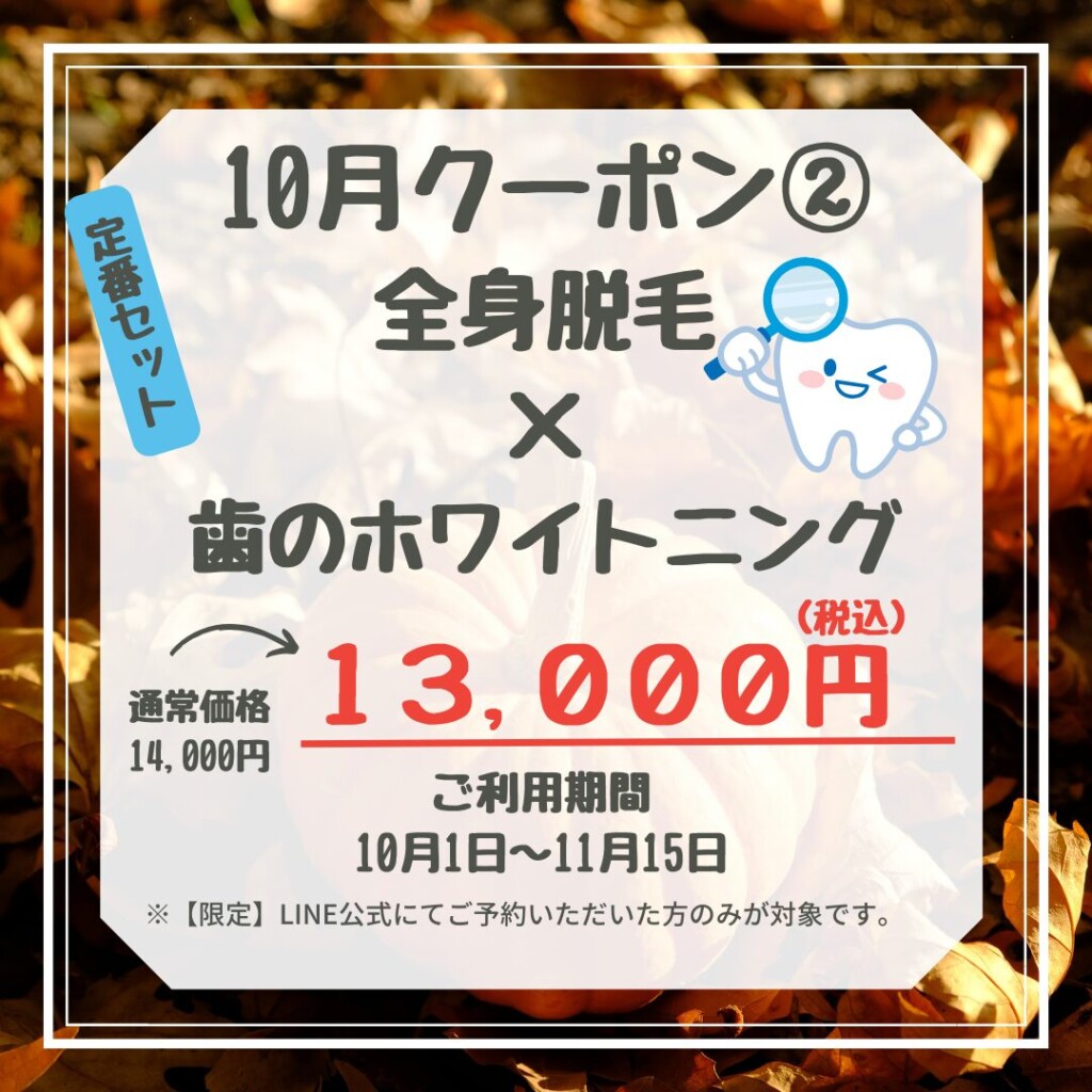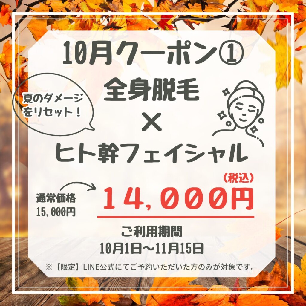 久々にクーポン登場の人気組み合わせメニューです!全身脱毛しつつ、お肌のエイジングケアもしたい方にオススメです★夏の紫外線ダメージの回復や乾燥対策としてお早めにケアすることで、この冬のお肌レベルを格上げしましょう!