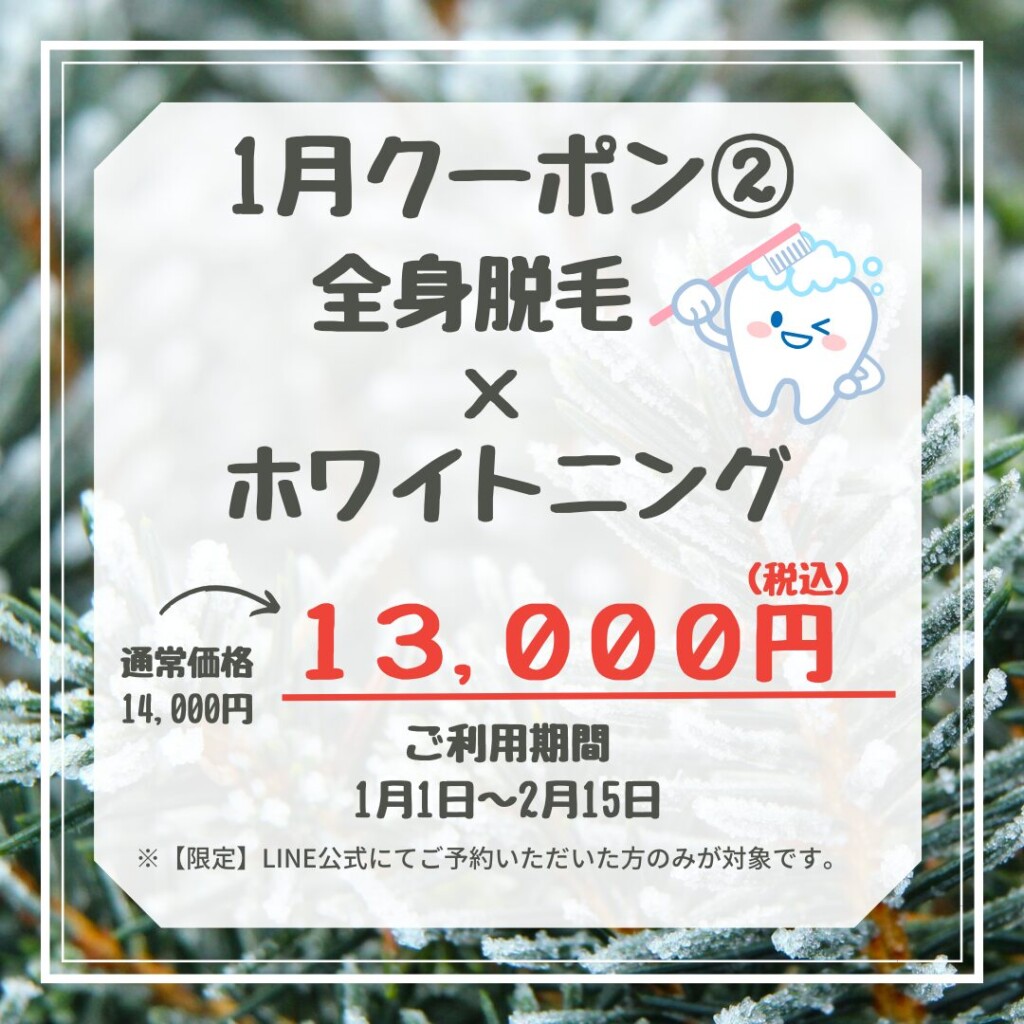 全身の脱毛とホワイトニングで第一印象アップを目指したい方にオススメです!全身脱毛と同時にホワイトニングの施術が可能なので短時間で施術可能です★定期的なメンテナンス利用にも、年度末のイベントに向けて印象アップの狙うのも◎